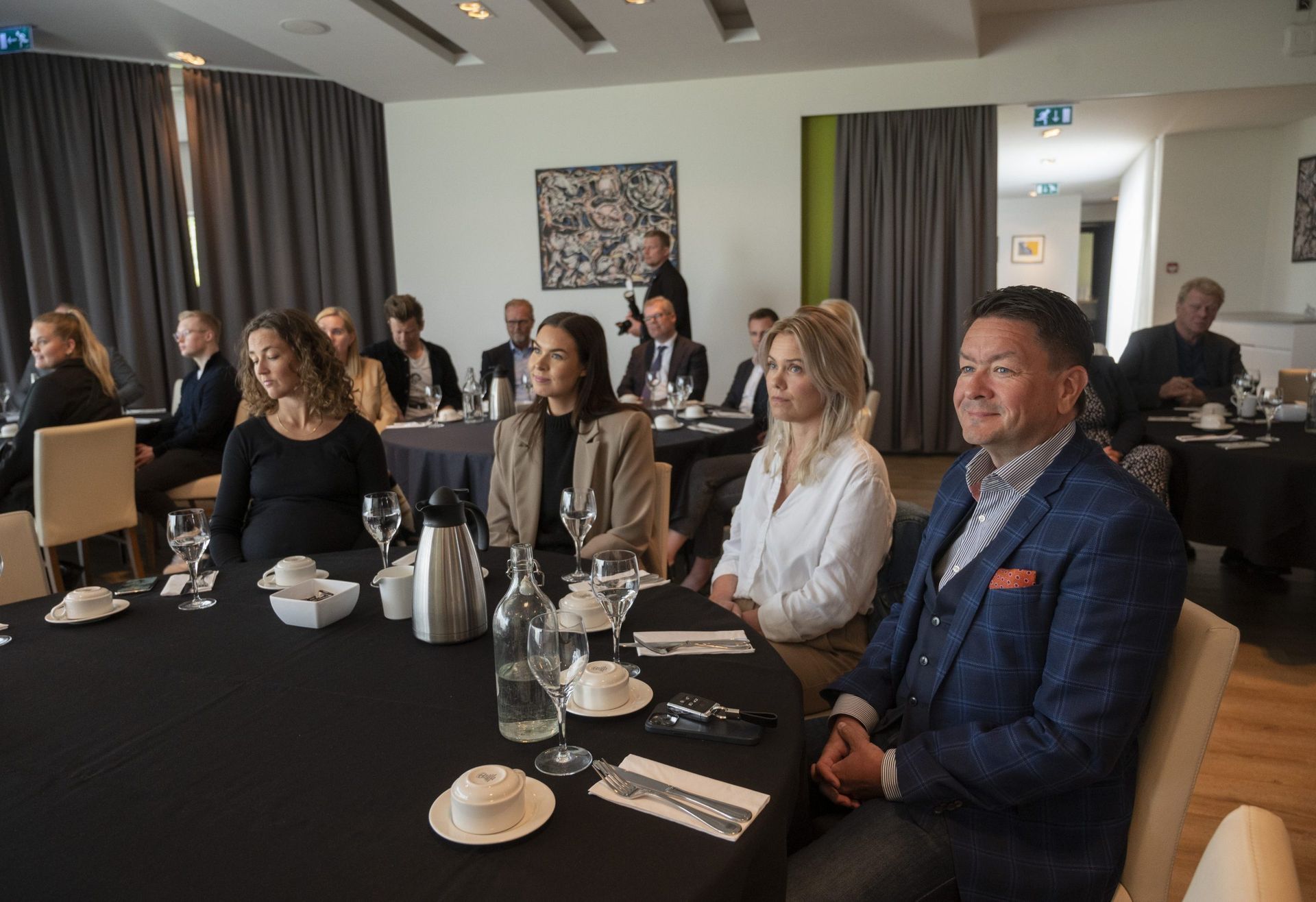 Svanhildur Hólm Viðskiptaráði, Gunnhildur Arnarsdóttir Stjórnvísi, Gunnlaugur B. Björnsson Viðskiptaráði, Guðmundur Þ. Þórhallsson, framkvæmdastjóri Lífeyrissjóðs verzlunarmanna, Birgir Jónsson forstjóri Play, Harpa Júlíusdóttir og Hrund Gunnsteinsdóttir frá Festu. Mynd: hag
