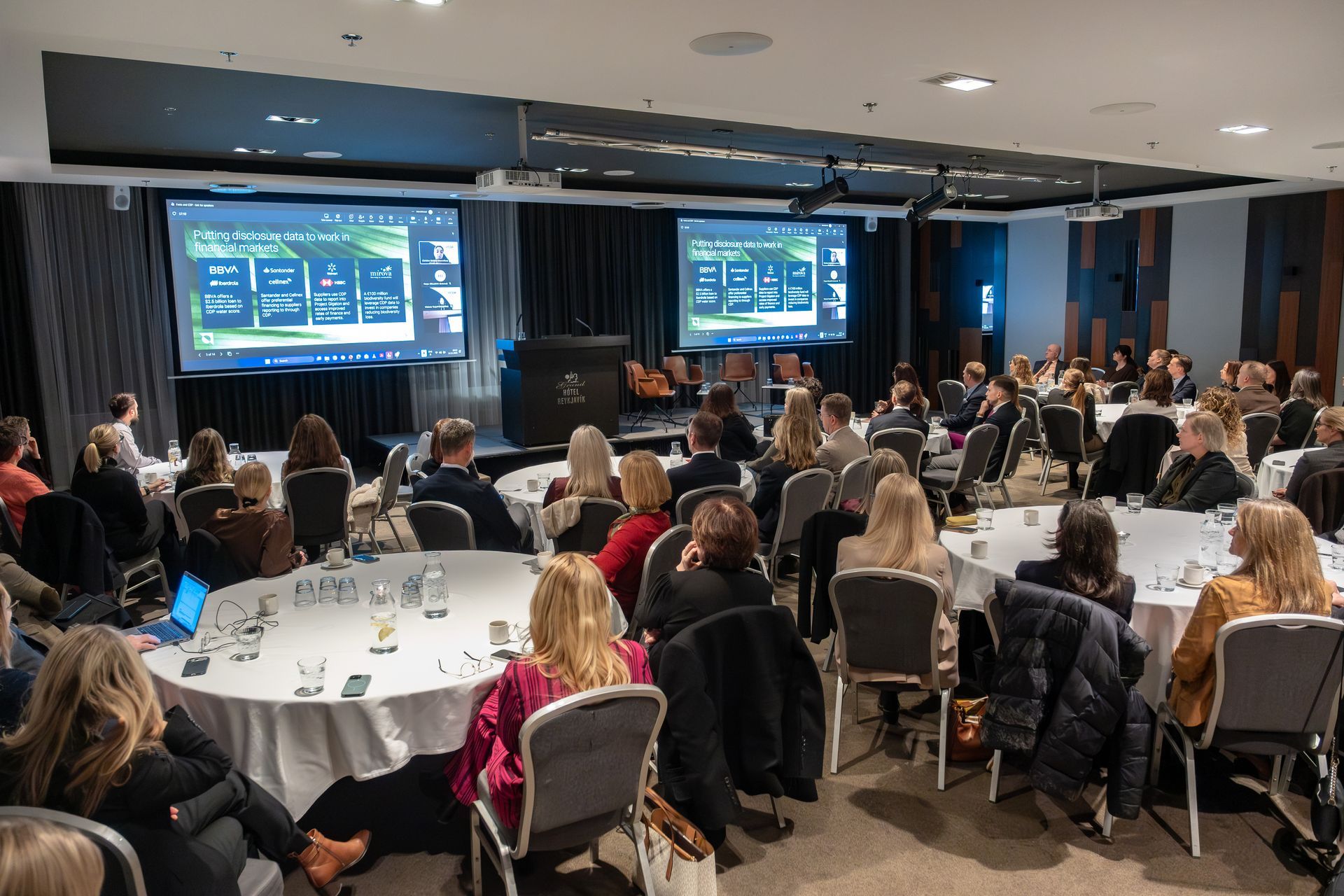 Erlendu gestir málþingsins, þær Melanie Vezjak og Christine Nolasco frá CDP (áður Carbon Disclousure Project), kynntu niðurstöður nýjustu greininga á stöðu loftslags- og umhverfismála meðal stærstu fyrirtækja heims svokallað Corporate Health Check. Þær bentu á að aðgerðarleysi í loftslagsmálum gæti dregið úr vergri landsframleiðslu heimsins um 18% fyrir árið 2050 og sýndu hvernig fyrirtæki geti samþætt sjálfbærni inn í viðskiptalíkön sín til að skapa bæði stöðugleika og ný tækifæri til verðmætasköpunar.